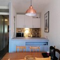 The apartment features a fully equipped open kitchen with a combined microwave oven, refrigerator, ceramic hob, dishwasher, and essential appliances like a coffee maker, kettle, toaster, and even a raclette grill for cozy evenings. The bathroom includes a bathtub, and the WC is separate. With a large wardrobe at the entrance, this apartment is designed for comfort and convenience.
