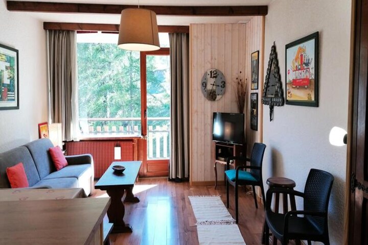 This charming studio, located on the 4th floor of a building with an elevator, offers a comfortable stay for up to 4 guests. It features a sleeping area with 2 bunk beds, a living room with a Rapido sofa bed, a flat-screen TV, and a dining area. The studio is non-smoking and pets are strictly prohibited. The south-facing balcony provides a lovely outdoor space to relax, while the apartment’s cozy design and parquet flooring create a warm atmosphere. A deposit is required upon arrival, and guests can access a ski box located at the entrance of the residence for convenient storage.