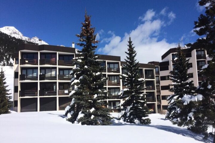 This cozy 3-room apartment for 6 people is ideally located just 100 meters from the slopes and the Chalvet Gondola, making it perfect for ski enthusiasts. Situated on the ground floor, the apartment offers a total living space of 57 m² with a west-facing orientation and direct access to the garden and two small terraces. The living room features a large corner sofa for 6 people, a coffee table, and a dining area with seating for 6. There is also a TV and access to the balcony with a beautiful view of Janus. The kitchen is equipped with 4 electric hotplates, a dishwasher, small oven, microwave, fridge with freezer compartment, coffee maker, toaster, and kettle.