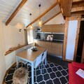 Inside, the apartment features a fully equipped kitchen with an induction hob, microwave, dishwasher, and refrigerator with freezer section, along with a coffee maker, kettle, and various kitchen accessories. The bathroom is equipped with a shower cabin, toilet, and bidet. The cozy living area includes a dining table for four, a sofa, and a television, making it a perfect space to relax after a day of skiing.