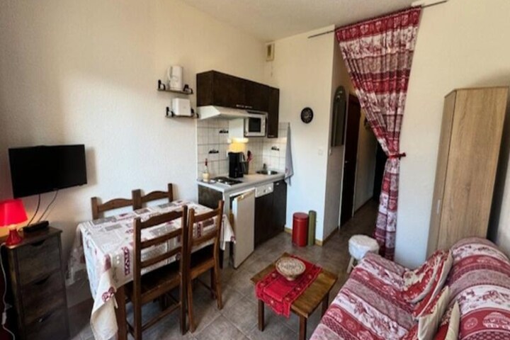 This cozy studio apartment for up to 4 people offers a comfortable stay with a convertible sofa and a mountain corner with bunk beds. The apartment is pet-friendly and located on the first floor, facing south with a stunning view of the surrounding mountains. The space includes essential amenities such as a wardrobe, cupboard, and clothes hooks for storage. A large parking lot is available for residents, and the property is non-smoking throughout.