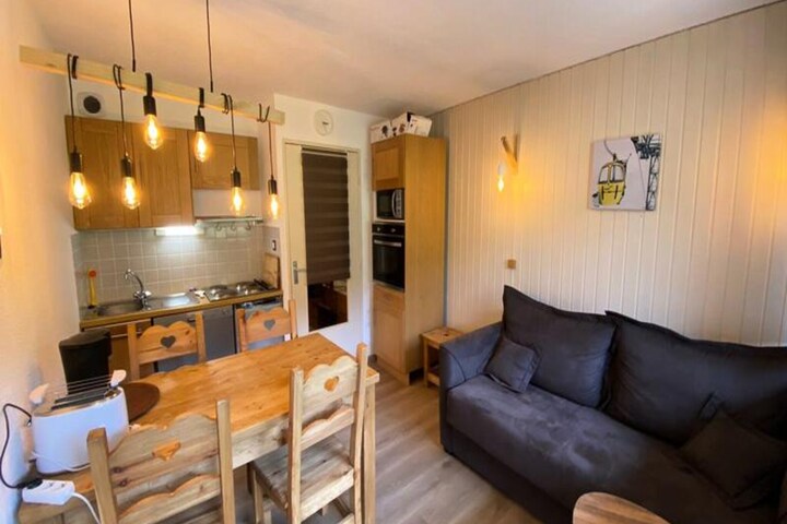 This cozy, renovated apartment accommodates 4 people with a double bedroom and a mountain corner featuring 2 bunk beds. The apartment is non-smoking and offers a balcony with a south-facing view of the slopes. It includes essential amenities like a wardrobe, chest of drawers, clothes hooks, and a ski locker. Please note, pets are not allowed, and bed linen and towels are not provided. End-of-stay cleaning is optional.
