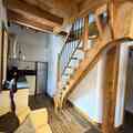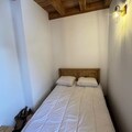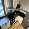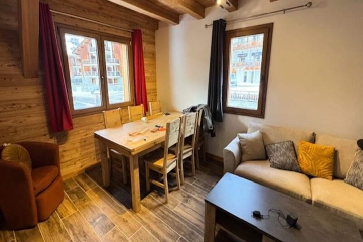 Inside, the duplex apartment is designed to accommodate up to five guests in style and comfort. The main floor features a welcoming entrance hall with a wardrobe, a fully equipped kitchen with modern appliances, and a cozy living room complete with a television and a comfortable sofa. The dining area, with its wooden table and chairs, invites you to share meals and stories after a day on the slopes. The main bedroom offers a double bed with plush bedding, while the upstairs refuge-style area under the beams provides additional sleeping arrangements with three single beds. A sleek shower room, separate WC, and heated ski locker add to the convenience.