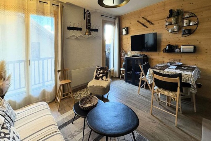 In the serene village of Le Mélezet, this beautifully renovated ground-floor studio apartment invites you to experience the charm of the French Alps. Imagine waking up to stunning mountain views from your northwest-facing balcony, with the crisp alpine air rejuvenating your senses. Whether you're here for a winter escape or a summer retreat, this cozy haven offers the perfect base for your adventures. A private outdoor parking spot ensures convenience, while the free local shuttle bus makes it easy to explore the nearby resort center, just a 5-minute drive away. \n\nStep inside to discover a thoughtfully designed living space with a large bay window that floods the room with natural light. The studio comfortably accommodates up to four guests, featuring a sofa bed (140 cm) in the living area and a sleeping alcove with two bunk beds. The open-plan kitchenette is fully equipped, allowing you to prepare delicious meals after a day of exploring. Modern amenities such as Wi-Fi and a washing machine add to the comfort and practicality of your stay. For winter sports enthusiasts, a dedicated ski locker in the residence ensures your gear is always ready for the slopes. \n\nLe Mélezet offers a tranquil escape while keeping you close to the action. The surrounding area is a paradise for outdoor enthusiasts, with ski slopes, hiking trails, and breathtaking alpine landscapes just moments away. After a day of adventure, unwind on your balcony, taking in the picturesque views as the sun sets over the mountains. This charming studio is more than just a place to stay—it's a gateway to unforgettable memories in the heart of the Alps.