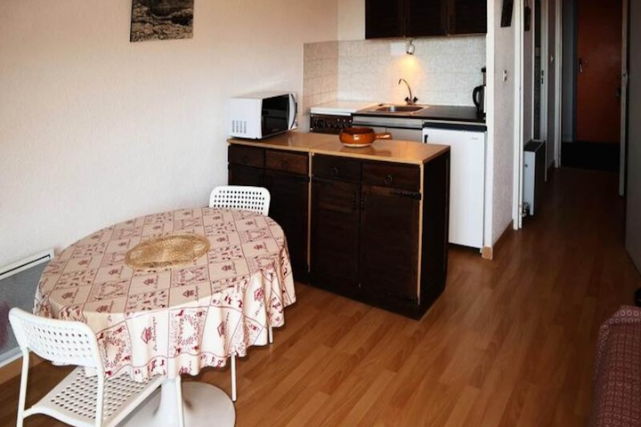 Designed to comfortably accommodate up to four guests, the studio features a thoughtful layout that maximizes space and comfort. The sleeping alcove includes two single bunk beds, while the living room boasts a double sofa bed, creating a versatile and welcoming environment for families or small groups. The kitchenette, open to the living area, is fully equipped for preparing hearty meals to fuel your mountain escapades. A modern shower room with toilet ensures all the essentials are covered, while the residence's ski locker adds an extra layer of convenience.
