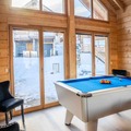 The chalet spans 130 square meters and features five beautifully appointed bedrooms, each with its own bathroom. The master suite on the ground floor boasts a luxurious double bed and an en-suite bathroom with a walk-in shower and bathtub. Upstairs, the remaining bedrooms offer flexible sleeping arrangements, including double beds, single beds, and bunk beds, ensuring comfort for all. The central living area is a true highlight, with large windows flooding the space with natural light and opening onto a terrace with panoramic views. Cozy evenings await in the living room, complete with a wood-burning stove, plush sofas, and a billiards area for entertainment. The dining room, designed for gatherings, comfortably seats 16, while the fully equipped kitchen makes meal preparation a breeze.