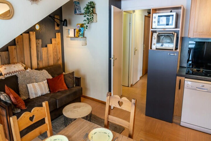 This 36m², newly redecorated apartment is designed for comfort, featuring a cozy living room with a sofa and a fully equipped kitchen with an oven, dishwasher, microwave, hob, fridge, and raclette machine. The dining table accommodates 7 people, ideal for sharing meals after a day of outdoor activities. The east-facing balcony offers scenic views of the slopes and mountains, perfect for enjoying sunny breakfasts. The apartment includes a master bedroom with a double bed, a second bedroom with bunk beds, and additional sleeping arrangements in the living room.