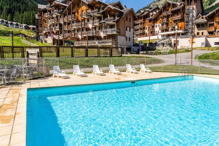 The residence boasts a heated outdoor swimming pool, open in both summer and winter, and sauna cabins, perfect for unwinding after a day on the slopes. Guests also enjoy private underground parking and a ski box for winter sports gear.