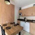 The apartment features a fully equipped kitchen with all necessary appliances, including a stove, microwave, and refrigerator, providing everything needed for a self-catered stay. A dining area is included, offering ample space for meals and gatherings. The bathroom comes with a bathtub for added comfort, and the residence includes a heated indoor swimming pool (seasonal), ideal for relaxing after a day of outdoor activities. The apartment is accessible via an elevator and offers ample storage space at the entrance for added convenience.