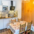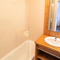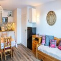 This 33m² apartment, facing North-East, provides a peaceful stay with modern amenities. It includes an entrance with storage, a cozy living room with a sofa bed and television, a dining area, and a fully equipped kitchen with a fondue set. The separate bedroom also has a television and a comfortable 140x190cm double bed. A bathroom with a bathtub and a balcony overlooking the resort, valley, and mountains complete the space, accommodating up to 4 people.