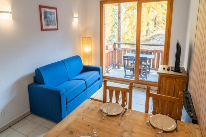 Property, along with its inviting features, provides a comfortable and well-equipped 2-room apartment that accommodates up to 4 people. The apartment includes a bedroom with a 140x190cm double bed, and a living room with a 140x190cm convertible sofa, making it ideal for small families or groups. It offers modern conveniences such as a television in each room, a coffee pod machine, and an electric fireplace. Guests can also enjoy a private balcony with garden furniture, providing scenic views of the Mazelière valley and larch forest. For convenience, there is private parking and a secure ski locker. Free activities include access to the on-site heated indoor swimming pool, open seasonally. Pets are not allowed, and parking spaces can be rented if needed.