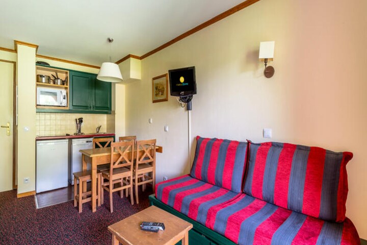 The apartment features a semi-open kitchen with a dining area, as well as a cozy living space. The bathroom is in good condition, and a baby kit (subject to availability) can be requested for families traveling with infants. Enjoy a relaxing mountain vacation in the heart of the Alps, with easy access to outdoor activities and a range of amenities.