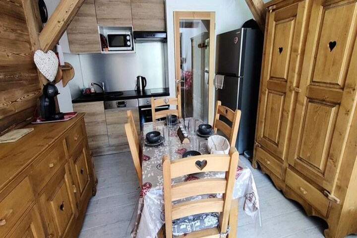 The well-equipped kitchen includes a refrigerator, oven, induction hob, microwave, Krups Dolce Gusto coffee maker, and an extractor hood, allowing guests to prepare their own meals. The living room is equipped with a TV for relaxation after a day on the slopes. The studio also features a pleasant south-facing balcony where guests can enjoy meals or unwind in the sun.