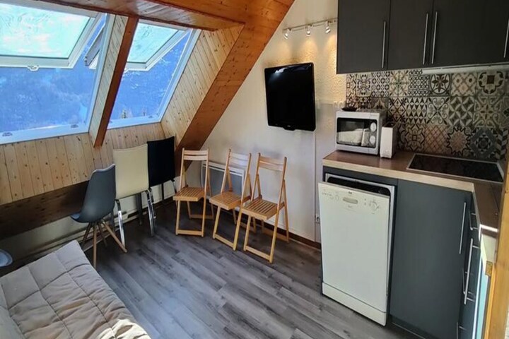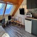 This warm and sunny apartment, perfect for up to four guests, is ideally situated with a south-facing view that offers a beautiful panorama of the mountains. The accommodation includes an entrance with stairs leading to a cozy bedroom featuring a 140x200 double bed and shelves. The bathroom has a bathtub and WC, and there's a ski locker for convenient storage of equipment. The living room offers a comfortable sofa bed with a 140x200 double bed, and large skylights provide plenty of natural sunlight, ideal for enjoying meals or relaxing in the sun. The kitchen is fully equipped with a refrigerator (with freezer), oven, filter coffee maker, ceramic hob, dishwasher, and microwave.