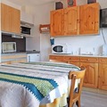 Inside, the apartment is thoughtfully designed to accommodate up to five guests. The entrance features a sleeping alcove with a sturdy bunk bed, while the main room combines a kitchenette, dining area, and living space complete with a sofa bed, flat-screen TV, and mini stereo system. A separate alcove with a double bed and wardrobe ensures privacy and comfort. The bathroom is equipped with a hairdryer, and the WC is conveniently separate. Ski lockers on the ground floor and paid Wi-Fi access make your stay even more practical.