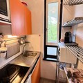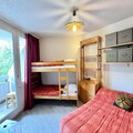 The apartment features a spacious living room with a south-west facing balcony, allowing plenty of natural light. The fully equipped kitchen includes a combination oven, dishwasher, microwave, Nespresso coffee machine, and toaster for all your cooking needs. The living room also has a sofa bed, and the separate bedroom is furnished with two single bunk beds and a double bed, as well as access to the balcony and a TV. A bathroom and separate toilet complete the layout.