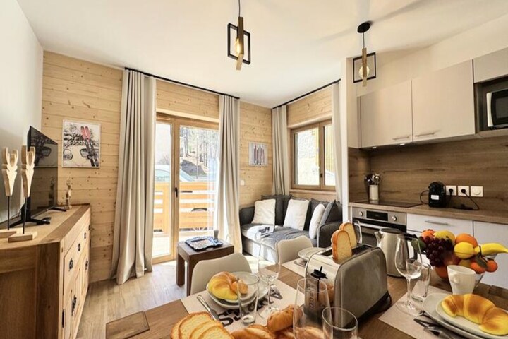 In the vibrant heart of Vars Les Claux, this newly built residence offers an exceptional alpine retreat just steps from the shops and a mere 150 meters from the ski slopes. Imagine waking up to the crisp mountain air and soaking in the natural light from your southeast-facing terrace, as the snow-covered peaks beckon you to explore. Whether you're here for winter sports or summer hikes, this modern apartment is your gateway to the beauty of the French Alps. \n\nInside, the apartment boasts a spacious and contemporary living room equipped with a TV, seamlessly connected to an open-plan kitchen. The kitchen is a chef's dream, featuring high-end appliances such as a Nespresso coffee machine, juicer, and dishwasher, ensuring every meal is a pleasure to prepare. The sleeping arrangements are designed for ultimate comfort, with a cozy bedroom offering two 120 x 200 cm beds and a second bedroom featuring a luxurious 160 x 200 cm double bed. A sleek bathroom and separate toilet complete the layout, while the private covered parking space adds convenience to your stay. \n\nThe residence’s prime location places you within easy reach of the ski slopes, making it perfect for avid skiers and outdoor enthusiasts. In summer, the surrounding trails and breathtaking landscapes offer endless opportunities for adventure. Nearby shops and restaurants ensure you have everything you need at your fingertips, while the charm of Vars adds a touch of magic to your vacation. \n\nWith linens provided, beds made upon arrival, and end-of-stay cleaning included, this apartment guarantees a hassle-free and memorable stay. Whether you're seeking thrilling days on the slopes or tranquil evenings in the mountains, this property is your ideal home away from home in Vars Les Claux.