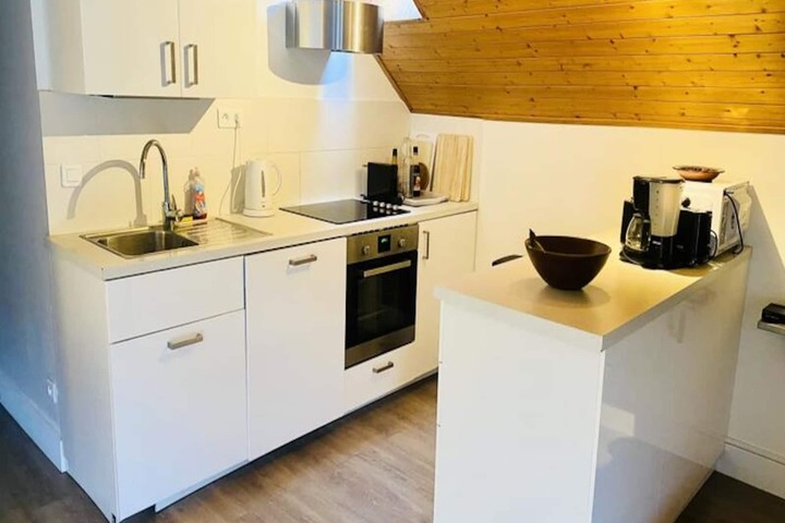 Inside, the 47m² apartment is thoughtfully designed to ensure comfort and relaxation. The sleeping arrangements include a cozy double bedroom, a room with bunk beds ideal for children or friends, and a sofa bed in the spacious living room. The fully equipped kitchen features an oven, microwave, dishwasher, and Nespresso coffee machine, making it easy to prepare hearty meals after a day of exploration. Gather around the dining table for a raclette or enjoy a game of cards in the warm ambiance of the living area. Additional amenities like Wi-Fi, a baby cot, a raclette grill, and a hairdryer are provided to enhance your stay.