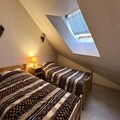 On the main level, you'll find a cozy double bedroom, a sofa bed in the living room, and a bathroom with a separate WC. Upstairs, two more bedrooms are located, one with a double bed and the other with two single beds. There is also a second bathroom and a separate toilet on this level, ensuring plenty of space and comfort for all guests.