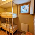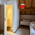 Upstairs, you’ll find a mezzanine with a TV corner and a dormitory featuring four single beds and a trundle bed, perfect for families. A shower room serves this level. On the lower floor, there are two double bedrooms and a room with two single bunk beds, along with a bathroom equipped with double sinks for added convenience.