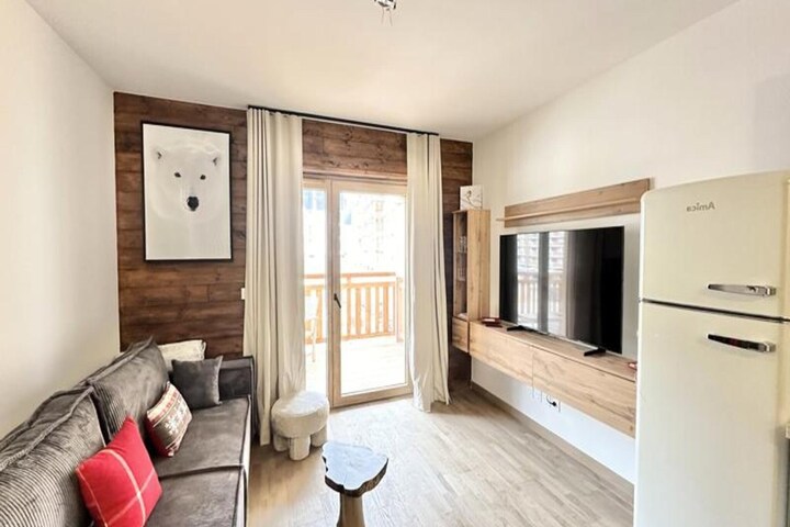 This charming 45 m² apartment, located on the third floor of a new residence, is perfect for up to 4 guests. With a southern exposure, it offers a bright and inviting space. The apartment includes a double bedroom, a cabin with bunk beds (suitable for both adults and children), and a spacious living area featuring a dining table, sofa, and television. A terrace provides a stunning mountain view.