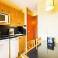 The apartment features an open kitchen area with a dining table for two and a bathroom with a bathtub and WC. For added convenience, the rental includes a covered parking space (at an additional cost), and guests can enjoy access to an outdoor heated swimming pool nearby. Housekeeping services and end-of-stay cleaning are available at an extra charge, ensuring a comfortable and effortless stay.