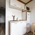 The apartment includes a fully equipped kitchen, open to the living room, perfect for preparing meals. The bathroom features a bathtub, and there is a separate toilet for convenience. A balcony with outdoor seating allows guests to enjoy meals or relax with mountain views. Additional amenities include a ski locker, sauna (for a fee), and free access to the outdoor pool from 4 p.m. to 7:30 p.m.