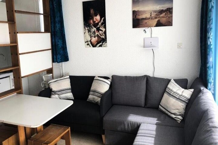 This cozy 30m² studio with a habitable hall offers an ideal retreat for up to four guests. Located on the fourth floor, the space features a habitable hall with two bunk beds, perfect for children or additional guests. The living room includes a corner sofa bed (140cm) and a small non-convertible sofa, along with a TV for relaxing after a day of activities. A south-facing balcony provides stunning views, and a dedicated ski cupboard ensures convenient storage. Please note, this property does not accommodate pets, and bed linen, towels, and end-of-stay cleaning are not included.