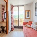 This cozy 32m² apartment on the fifth floor offers a delightful retreat with unobstructed views of the mountains, golf course, and tennis courts. It features a bedroom with chaise longue-style trundle beds for two, a cabin area with two bunk beds, and a living room with another set of chaise longue-style trundle beds, ensuring ample space for up to six guests. The apartment is pet-free, maintaining a clean and allergy-friendly environment. Please note that bed linen, towels, and end-of-stay cleaning services are not included, allowing guests to personalize their experience.