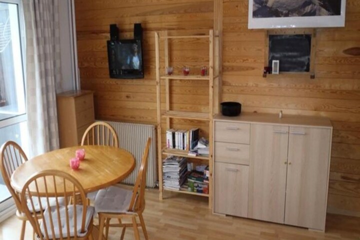 This cozy 32m² studio, located on the first floor of a well-positioned residence, comfortably accommodates up to 5 guests. The mountain corner features two bunk beds, while the living room offers a BZ sofa (160 x 200) and a TV for relaxation. The property is not pet-friendly, ensuring a tranquil stay for all guests. A south-facing balcony offers lovely views, and a ski closet (No. 23) is provided for convenient ski storage.