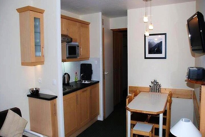 This charming 27m² apartment is located on the eighth floor, offering a stunning view of the station. The bedroom is furnished with a comfortable double bed, while the living room features a pull-out sofa (suitable for 2 people) and an additional single bed, ideal for accommodating up to 4 guests. The apartment is not pet-friendly, ensuring a quiet and restful atmosphere. A south-facing balcony enhances the experience with beautiful views of the surrounding area, and a ski cupboard is available for storing your ski gear.