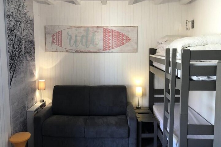 This cozy, renovated 24m² studio apartment offers a practical and comfortable space for your stay, featuring a living room with a sofa bed and two bunk beds, perfect for accommodating up to four guests. The property is not pet-friendly, ensuring a quiet and relaxed atmosphere for all visitors. The modern design and thoughtful layout make it a great choice for those seeking comfort and convenience.