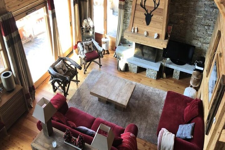 The chalet features a fully equipped American kitchen with an induction hob, oven, microwave, fridge-freezer, dishwasher, toaster, coffee maker, washing machine, and dryer. The bathrooms include separate showers, a bathtub, and WC. The spacious living room has two sofas, a TV, a fireplace, and free Wi-Fi. A large south-facing terrace offers stunning views, and a garage is available. Bed linen, towels, and end-of-stay cleaning are not provided, but heating ensures comfort throughout your stay.
