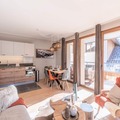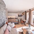 Apartment A101, located on the first floor of Building A, is a cozy haven designed with local materials that exude warmth and authenticity. The bright living room invites you to relax after a day on the slopes, while the open-plan kitchen and dining area are perfect for sharing meals with loved ones. Step out onto the south-facing balcony to soak in the crisp mountain air and stunning alpine scenery. The apartment comfortably accommodates up to five guests with a double bedroom and a second bedroom featuring three single beds, including a bunk bed. A separate bathroom and toilet ensure convenience for all.