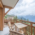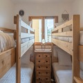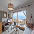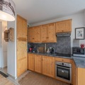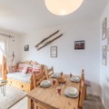 Inside, the apartment is thoughtfully designed to combine comfort and authenticity. The open-plan kitchen flows seamlessly into the cozy living and dining areas, creating a welcoming space for shared meals and relaxation. The property accommodates up to four guests, featuring a double bedroom and a children’s room with bunk beds. A south-facing balcony offers a tranquil spot to sip a warm drink while soaking in the panoramic alpine vistas. Additional amenities include a ski locker, ensuring convenience for winter sports enthusiasts.
