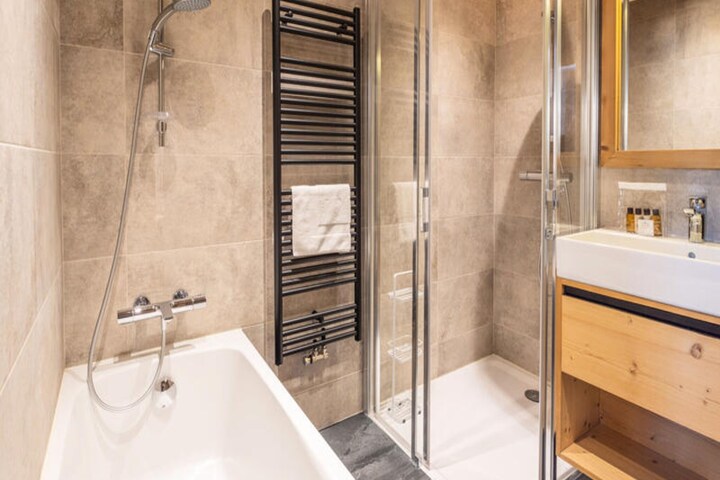 Spanning an impressive 130m², the apartment is thoughtfully designed to accommodate 4 adults and 4 children in comfort and style. The open-plan kitchen is fully equipped for culinary adventures, while the spacious dining area and cozy TV lounge invite you to relax and reconnect after a day of exploration. The layout includes two en suite double bedrooms, a children’s room with two bunk beds, and additional bathrooms for convenience. A magnificent terrace offers a serene space to unwind and soak in the alpine ambiance.