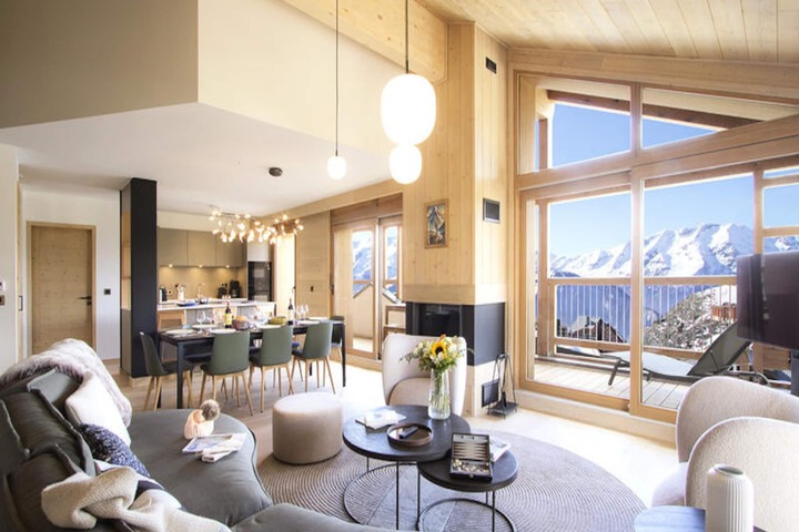 In the serene embrace of the French Alps, this stunning duplex apartment offers a harmonious blend of luxury and alpine charm. Bathed in natural light, the 126 m² residence is thoughtfully designed to provide an unforgettable ski-in/ski-out experience. Whether you're gazing at the snow-dusted peaks or soaking up the sun on the expansive 24 m² southwest-facing balcony, every moment here feels like a retreat into tranquility. The residence also boasts exclusive amenities including an indoor pool, gym, sauna, steam room, and sensory showers, ensuring relaxation after a day of adventure. \n\nStep inside to discover a cathedral-style living room adorned with a cozy wood-burning fireplace and plush seating, perfect for unwinding with loved ones. The fully equipped kitchen, featuring modern appliances such as an espresso machine and blender, invites culinary creativity, complemented by a stylish dining area for shared meals. The apartment accommodates up to eight guests across four elegant bedrooms, including two with private shower rooms and balconies offering breathtaking views. A desk area caters to those who need to stay connected, while a washing machine adds convenience for longer stays. \n\nWith direct access to the slopes from the ski room, your alpine adventures begin the moment you step outside. Beyond skiing, the vibrant surroundings offer hiking trails, picturesque villages, and local gastronomy to explore. Whether you're seeking adrenaline or serenity, this residence is your gateway to the best of the French Alps. \n\nChoose this exceptional property for an unforgettable mountain escape, where every detail is curated to create lasting memories.