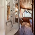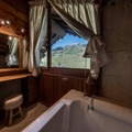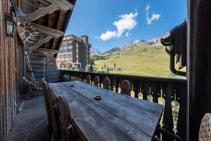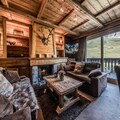 Spanning 120m², the apartment comfortably accommodates up to six guests across its thoughtfully designed spaces. The ground floor features a cozy living and dining area complete with a fireplace and television, perfect for unwinding after a day on the slopes. The separate, fully equipped kitchen includes modern appliances such as a Nespresso machine and washer-dryer, ensuring all the comforts of home. The double bedroom on this level opens onto a terrace, where two sun loungers and a dining table invite you to soak in the breathtaking views. Upstairs, you’ll find a spacious double bedroom, a charming sleeping alcove with bunk beds, and a luxurious bathroom with a shower, bathtub, and double vanity. Ample storage and high-end amenities complete the experience.