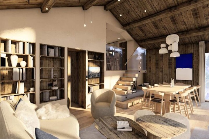 Spanning 220m², the chalet comfortably accommodates 8 adults and 5 children across four beautifully appointed levels. The master bedroom and additional double bedrooms feature en suite bathrooms for ultimate privacy, while the family room on the top floor offers a cozy sanctuary for children and parents alike. The heart of the home is the open-plan living area, where a crackling fireplace invites you to unwind after a day on the slopes. A fully equipped kitchen and utility room ensure convenience, while the spa on the lower level, complete with a sauna and relaxation area, promises rejuvenation. Step outside to the terrace and immerse yourself in the private jacuzzi, surrounded by panoramic alpine views.