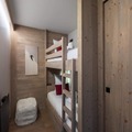 Inside, the 133m² apartment is a haven of comfort and style, accommodating up to six adults and four children. The thoughtfully designed layout includes a spacious living room with a cozy lounge area, a dining room, and an open-plan kitchen perfect for shared meals. Each of the three double bedrooms features a TV, with one offering an en-suite shower room and balcony access. The children’s bunk rooms are ideal for younger guests, complete with en-suite facilities. Modern conveniences such as a laundry room, Wi-Fi, and a ski locker ensure a seamless stay, while the balcony running the length of the apartment invites you to unwind with panoramic alpine views.
