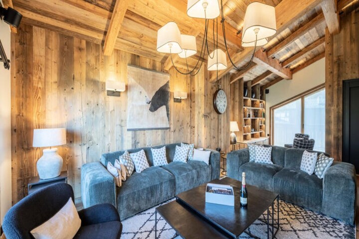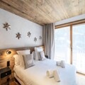 This exquisite 4-level chalet offers 270m² of luxury, accommodating up to 10 guests. It features 5 en-suite bedrooms, including a family suite with a master bedroom and children's bedroom with bunk beds. The master suite offers a balcony and a lavish bathroom with both a bathtub and shower. Other amenities include a ski room with a boot dryer, a safe, and the property is pet-friendly (for a fee).