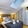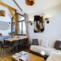 Inside, the penthouse features a cozy living room with a sofa and armchairs, a fully equipped open kitchen, and a dining area. The spacious balcony provides an exceptional view of the slopes, perfect for unwinding after a day of outdoor adventure. Additional amenities include bed and bathroom linens, as well as daily cleaning services to ensure a carefree stay.
