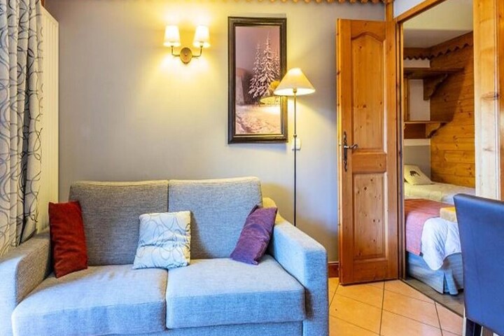 This charming apartment, located on the 4th floor of a recent high-quality residence, offers comfortable accommodations for up to 6 people. The bright living room features a convertible sofa (160x190 cm) and a TV. The master bedroom has a double bed (160x200 cm), while the second bedroom offers two single beds (80x190 cm) that can be joined. The apartment is pet-free, ensuring a peaceful environment. A ski locker and covered parking space are provided for your convenience.