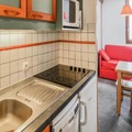 The apartment features a semi-open kitchen for preparing meals, along with a dining table for four. The living area is bright and welcoming, with a cozy atmosphere. The balcony offers a southern exposure and a pleasant space to enjoy the outdoors. For additional comfort, bed linens, towels, and end-of-stay cleaning services are available for an extra charge, ensuring flexibility throughout your stay.