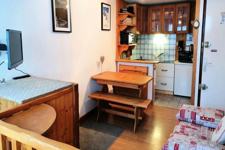 High above the bustling heart of Plagne Centre, this charming split-level apartment invites you to experience the magic of the French Alps in style and comfort. With its south-facing terrace overlooking the slopes, every moment here feels like a postcard come to life. Whether you're sipping coffee as the sun rises over the snowy peaks or unwinding after a day of adventure, the panoramic views set the perfect tone for your alpine escape. The residence is ideally located at the foot of the slopes, ensuring seamless access to skiing and the vibrant shopping mall just steps away. \n\nInside, the apartment is thoughtfully designed to accommodate up to five guests. The open-plan kitchen is equipped with modern appliances, including ceramic hobs, a microwave, oven, refrigerator, and dishwasher, making it easy to prepare meals after a day on the slopes. The cozy living room features a double sofa bed and a TV, while the upstairs sleeping area offers a double bed and a single bed, perfect for families or small groups. The bathroom includes a bathtub for a relaxing soak, and the separate toilet adds convenience. Warm duvets and blankets ensure a restful night’s sleep, while the ski locker provides practical storage for your gear. \n\nStep outside and immerse yourself in the lively atmosphere of Plagne Centre. From ski schools and rental shops to après-ski bars and restaurants, everything you need is within easy reach. In summer, the mountains transform into a haven for hikers and cyclists, with trails that showcase the region’s breathtaking beauty. Whether you’re here for winter sports or summer adventures, this apartment offers the perfect base for exploring the wonders of the Alps. \n\nChoose La Meije Residence for an unforgettable getaway where comfort meets convenience, and every day brings a new alpine adventure.