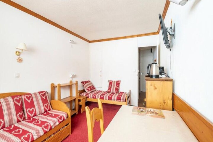 High above the snowy slopes of Plagne Centre, this charming studio invites you to experience the magic of the French Alps in every season. Wake up to breathtaking views of the pistes from your south-facing balcony, where the crisp mountain air sets the tone for a day of adventure. Whether you’re here for skiing, snowboarding, or simply soaking in the alpine atmosphere, this cozy retreat offers the perfect base for your holiday. Located on the 7th floor with elevator access, it combines convenience with stunning panoramas. \n\nInside, the studio is thoughtfully designed to accommodate up to three guests. The living area features two single trundle beds and an additional single bed, ensuring restful nights after active days. A compact kitchen equipped with electric hobs, a combination oven, dishwasher, and refrigerator makes meal preparation a breeze, while the dining area provides a welcoming space to gather. The bathroom includes a bathtub and integrated toilet, adding to the comfort of this well-appointed space. \n\nSituated at the foot of the slopes, the residence connects directly to shops via a gallery, making it easy to access everything you need. A ski locker is conveniently located on level 1, ensuring hassle-free storage for your gear. Outdoor parking nearby adds to the practicality of this location. With the pistes just steps away, you can enjoy effortless access to world-class skiing and snowboarding in the Paradiski domain. \n\nWhether you’re seeking thrilling winter sports or tranquil summer hikes, this studio offers an unbeatable combination of comfort, location, and alpine charm. Create unforgettable memories in the heart of the French Alps, where every moment is framed by the beauty of the mountains.