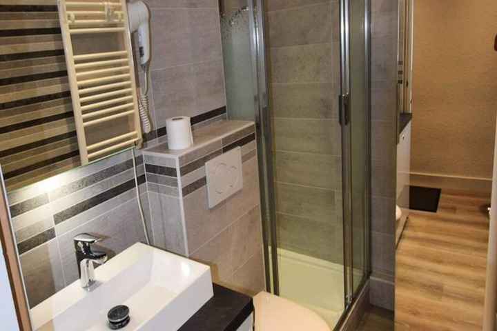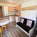 Step inside and discover a cleverly designed 22m² space that combines comfort and functionality. The studio features a modern kitchen equipped with induction hobs, a multifunction oven, refrigerator, and dishwasher, making it easy to prepare hearty meals after a day on the slopes. The living area boasts a dining space and a fold-down double wall bed, while the cabin area offers snug bunk beds for two. A contemporary bathroom with a shower and WC completes the layout, ensuring a comfortable stay for up to four guests. Please note, the property is non-smoking and pet-free, ensuring a pristine environment for all visitors.