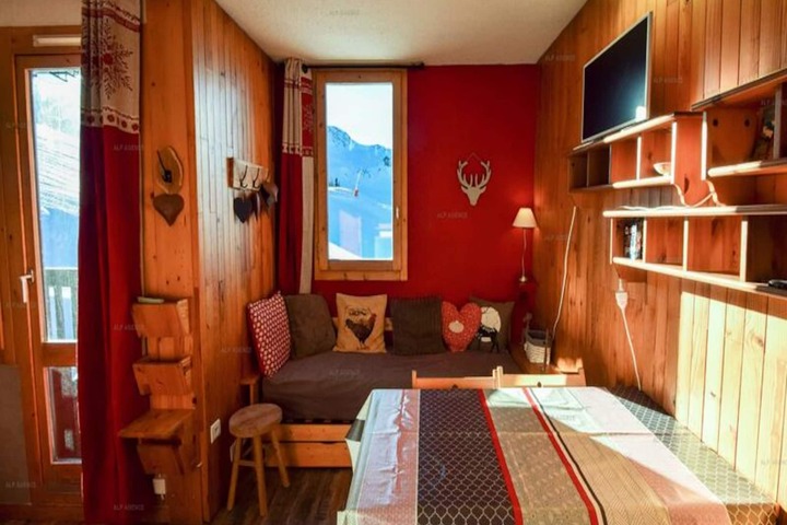 Bask in the serene beauty of the French Alps at this charming studio in the Les Gentianes Residence, located in the picturesque Plagne Villages. With its south-west facing balcony offering stunning views of the snow-covered slopes, this cozy retreat is the perfect escape for a couple or a small group of up to four people. Whether you're here to ski, relax, or simply enjoy the mountain air, this studio provides an inviting base for your alpine adventures. \n\nThe 22m² studio is thoughtfully designed to maximize comfort and functionality. The living area features two sofa beds and two trundle beds, ensuring flexible sleeping arrangements for guests. A well-equipped kitchenette includes ceramic hobs, an oven, a microwave, and a refrigerator, making it easy to prepare meals after a day on the slopes. The bathroom is fitted with a shower and toilet, and additional amenities such as a washing machine and a ski locker on the ground floor add to the convenience. \n\nSituated at the foot of the slopes, this residence offers unbeatable ski-in/ski-out access, allowing you to hit the pistes as soon as you step outside. For those looking to explore the area, Plagne Villages is connected to Plagne Centre by the TELEBUS, a pedestrian or ski cabin that makes getting around effortless. Shops, restaurants, and après-ski activities are just 500 meters away and easily accessible by shuttle. \n\nWhether you're drawn by the thrill of skiing, the charm of the alpine village, or the tranquility of the mountains, this studio offers a warm and welcoming haven. Create unforgettable memories in the heart of the French Alps, where every moment is framed by breathtaking landscapes and the promise of adventure.