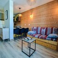 Spanning 40m², this 2-room apartment with a cabin comfortably accommodates up to six guests. The open-plan kitchen is fully equipped with a refrigerator, freezer, electric hob, oven, microwave, dishwasher, and even specialty appliances like a raclette and fondue set for cozy evenings. The living area features a dining space and a lounge with two pull-out single beds that can convert into a double, while the bedroom boasts a luxurious double bed and balcony access. A separate sleeping area with bunk beds ensures ample space for families or groups. Modern conveniences like a washing machine, TV, and ski lockers enhance your stay, while the sleek bathroom with a shower adds a touch of luxury.