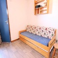 This 23m² studio, situated on the 2nd floor of a residence with an elevator, comfortably accommodates up to four guests. The living room features a set of trundle beds, while a sleeping alcove offers a set of bunk beds, making it a great choice for families or small groups. The east-facing balcony provides stunning views of the slopes and resort, perfect for enjoying your morning coffee or unwinding after a day of activities. The kitchen is equipped with electric hobs, an oven, and a refrigerator, ensuring you have everything needed to prepare meals during your stay. A bathroom with a bathtub and a separate toilet adds to the convenience, while a television and ski locker enhance your comfort.